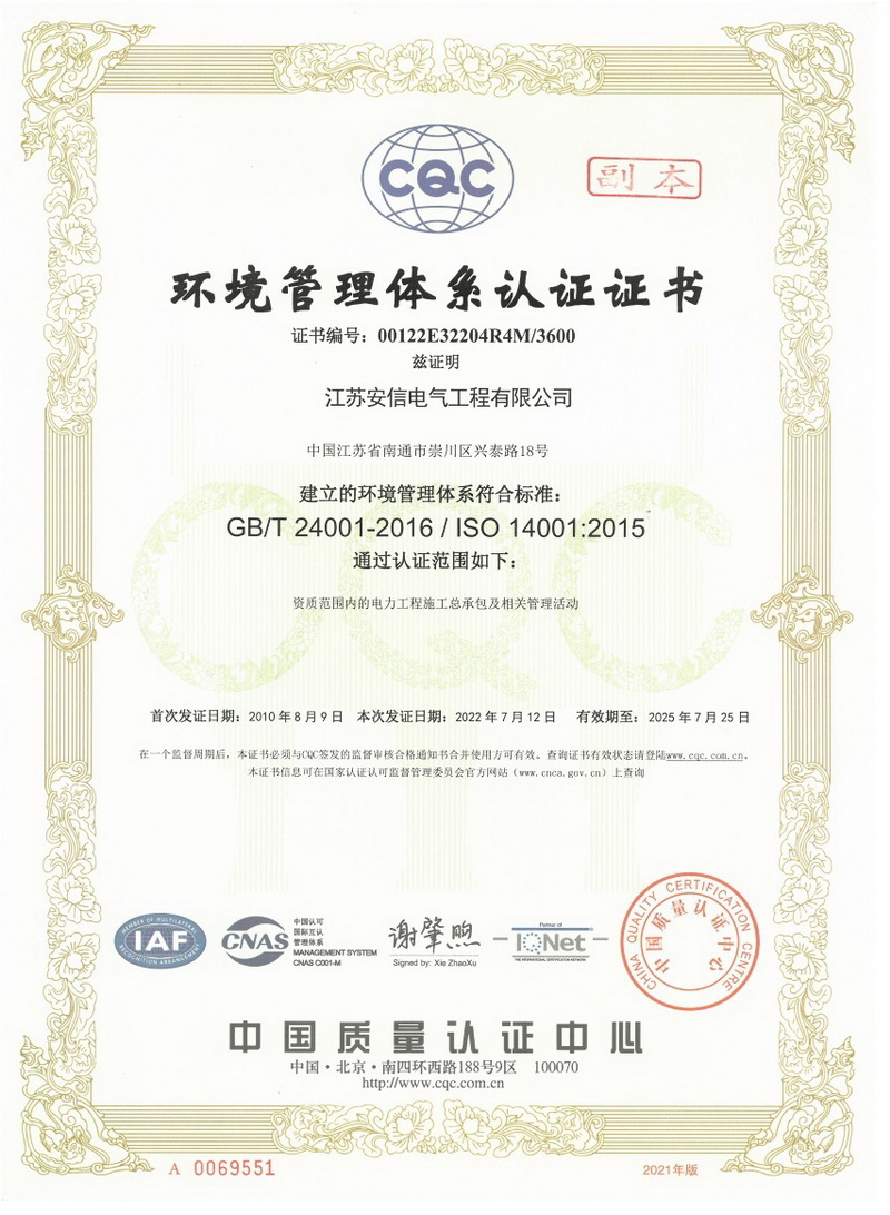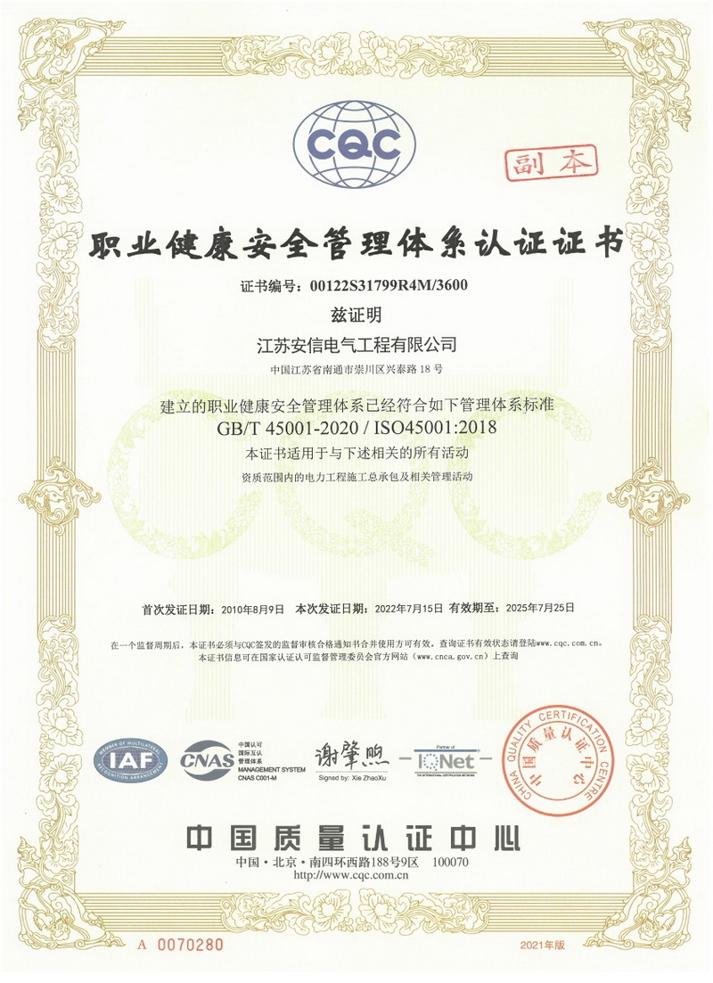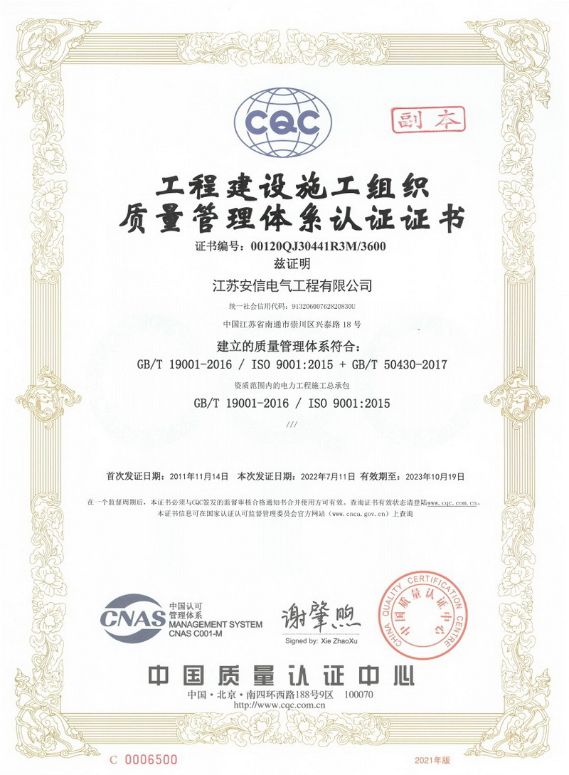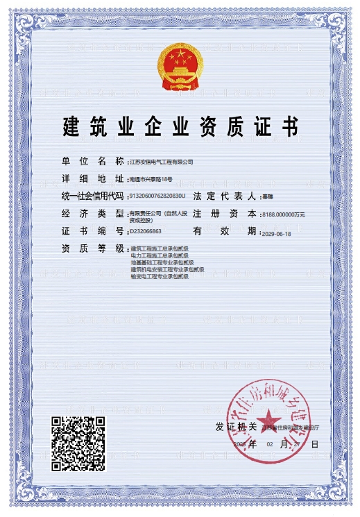 在創(chuàng)業(yè)之初,公司就堅持高起點的戰(zhàn)略思路,廣納賢才,集聚行業(yè)精英,創(chuàng)新發(fā)展,做優(yōu)企業(yè)品牌。現(xiàn)已取得:承裝二級、承修二級、承試二級,電力工程施工總承包二級,輸變電工程專業(yè)承包二級,建筑工程施工總承包二級,建筑機電安裝專業(yè)承包二級,地基基礎(chǔ)專業(yè)承包二級資質(zhì)證書,并通過了質(zhì)量、環(huán)境、職業(yè)健康和安全管理體系認證,確保各項工作有序管控。